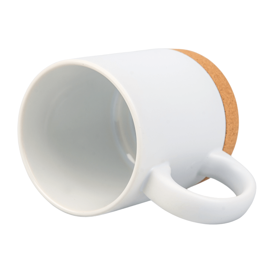 Matte ceramic mug for sublimation printing. The outside of the mug is covered with a special coating for sublimation.The cork bottom can provide additional thermal insulation or protect the surface on which the cup stands.