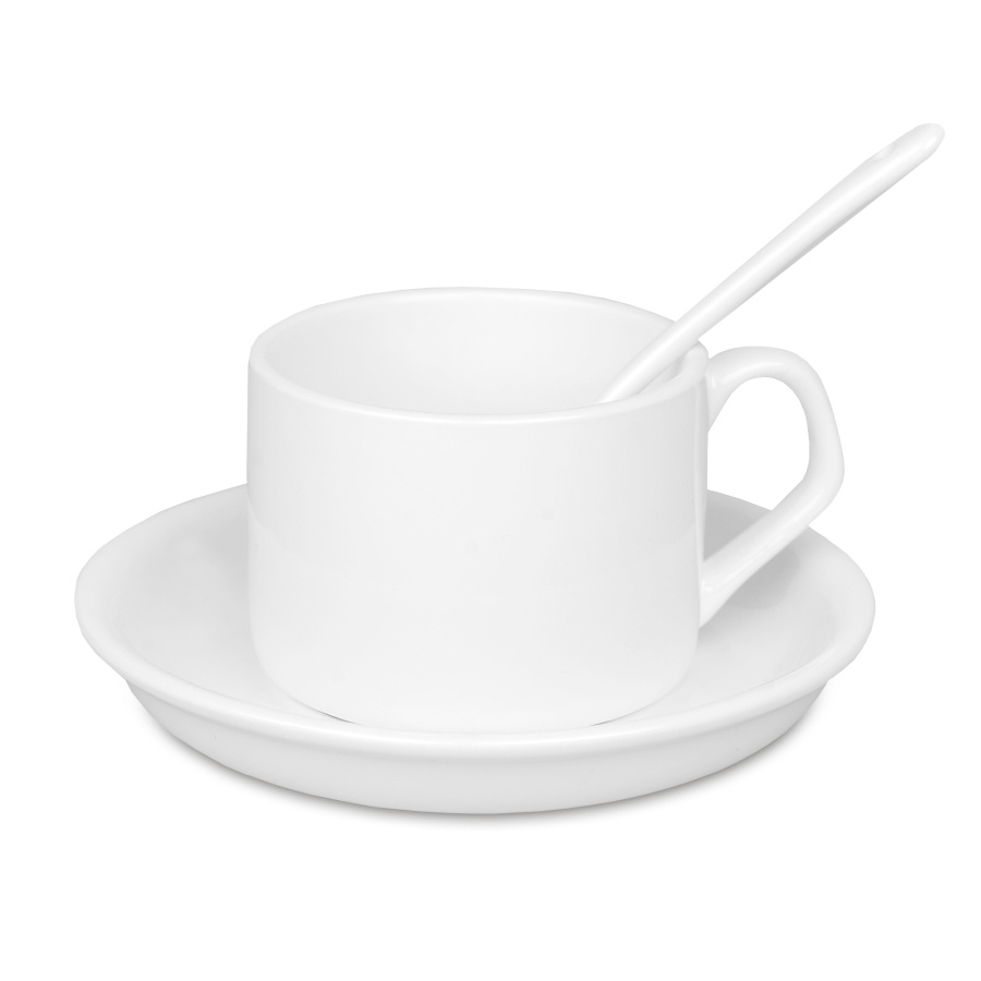 Ceramic cup for sublimation printing. The outside is covered with a special coating for sublimation.Ceramic cup with saucer and spoon: