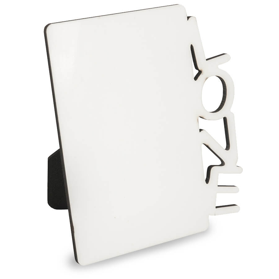 Panel- MDF frame with base with white glossy coating. On the side cut out the word LOVE- imprint area: 15cm x 17.8cm