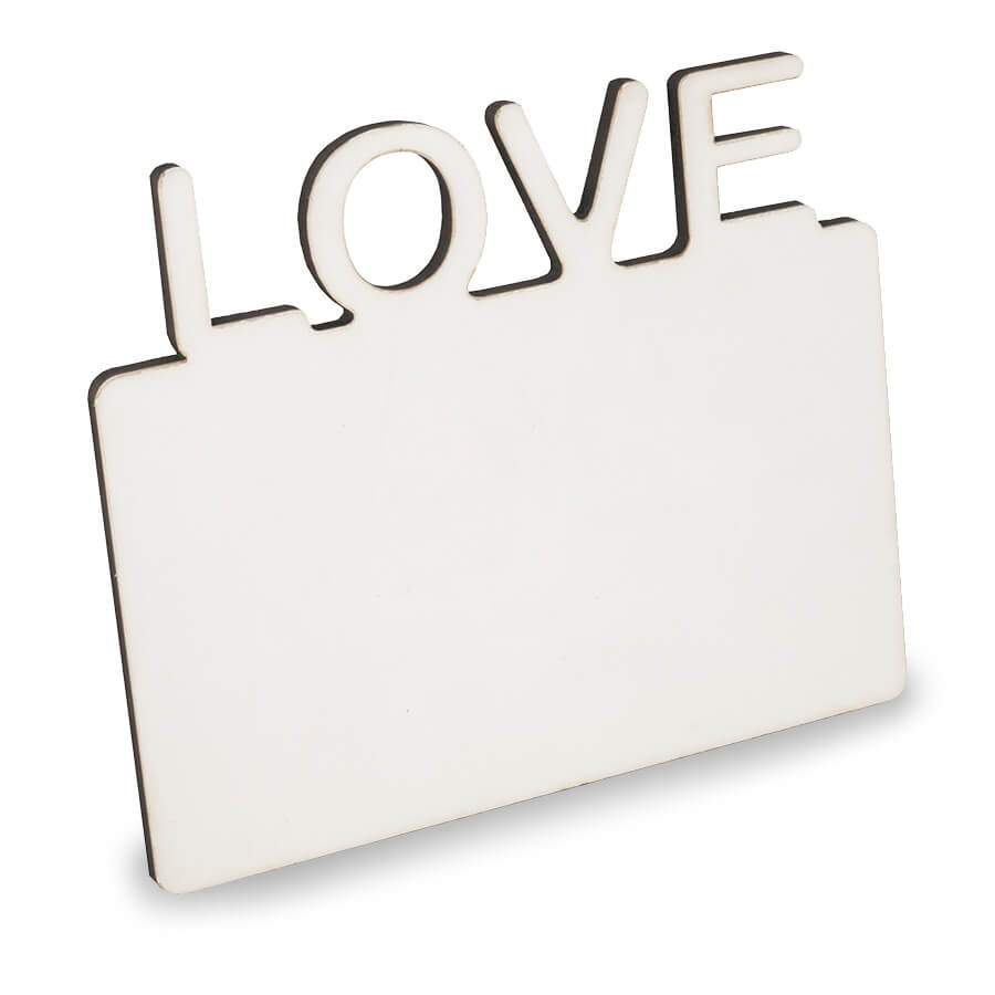 Panel- MDF frame with base with white glossy coating. At the top cut out the word LOVE- imprint area: 11cm x 17.8cm