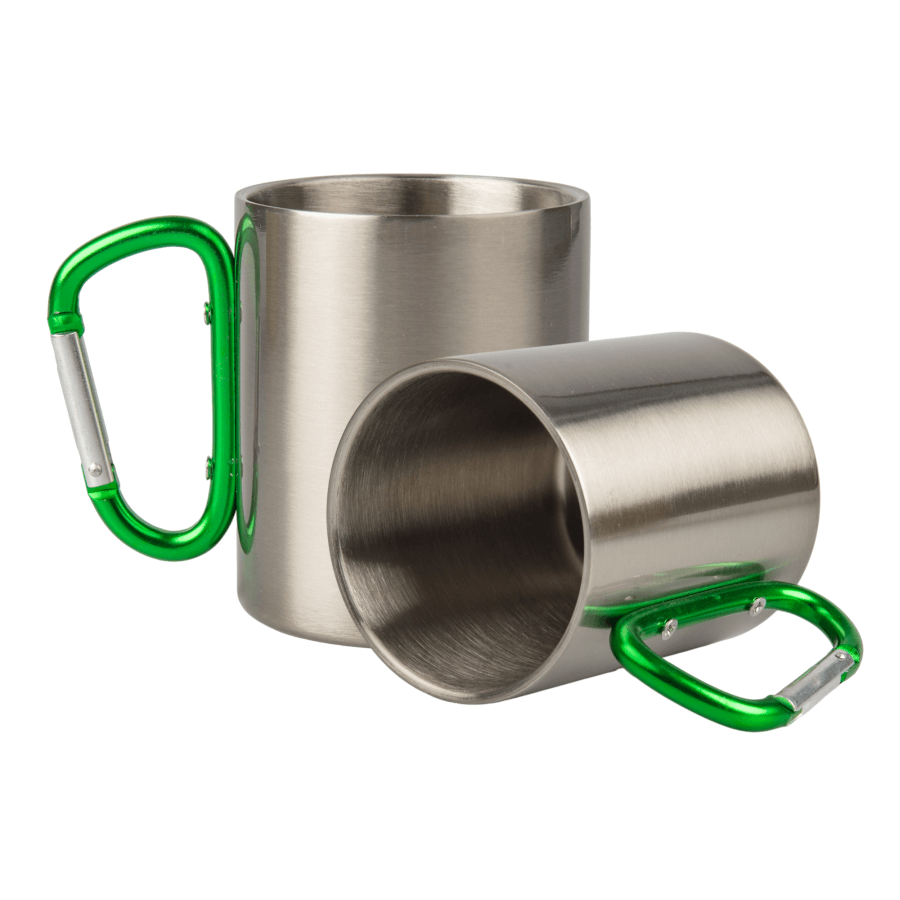 Shiny steel mug with double walls. It is covered with a special coating, designed for sublimation.The green steel ear is also a buckle, carabiner-type fastener, allowing you to attach the cup to a backpack, belt, etc.