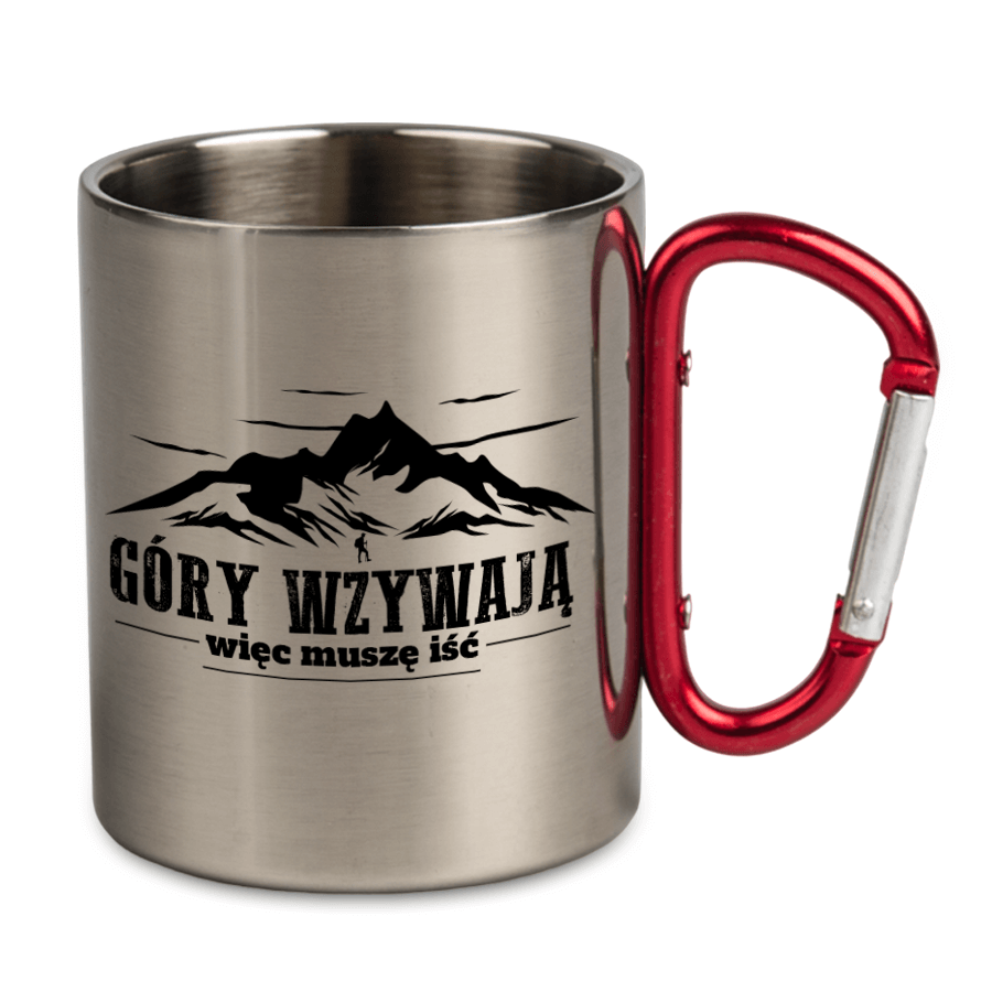 Shiny steel mug with double walls. It is covered with a special coating, designed for sublimation.The red steel eye is also a buckle, carabiner-type fastener, allowing you to attach the cup to a backpack, belt, etc.