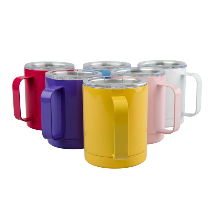 Steel mug with handle for sublimation printing. The outside of the mug is covered with a special coating for sublimation.