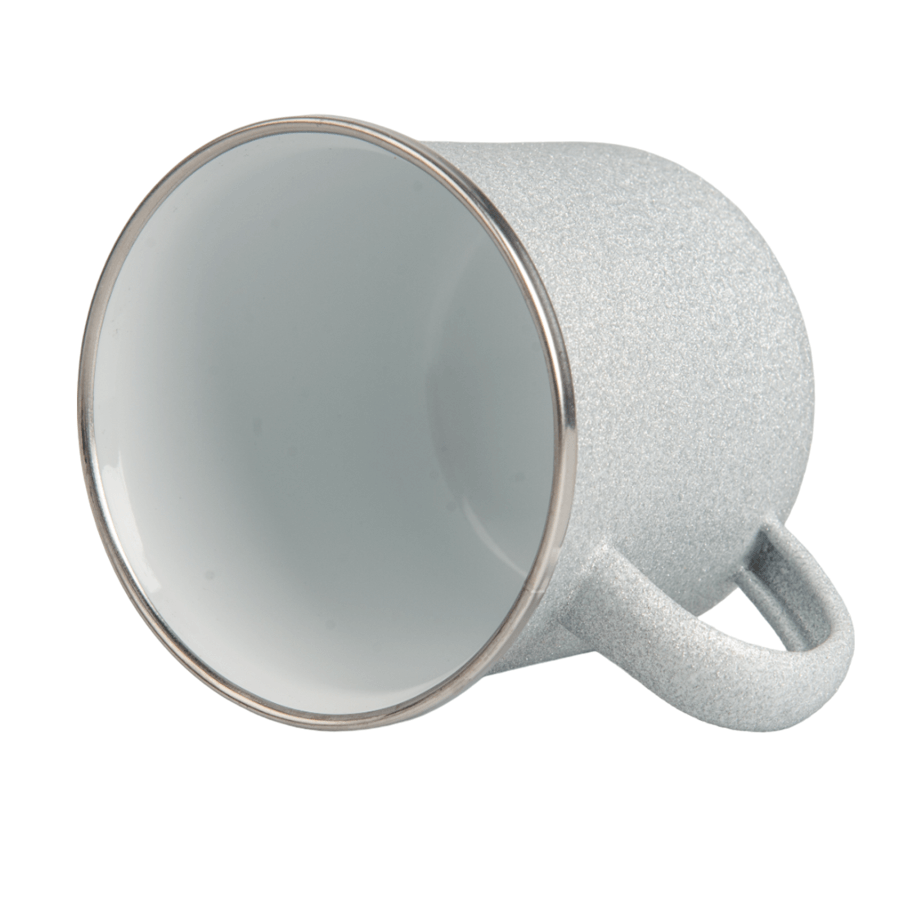 Silver glitter enamel steel mug (white center). The outside of the mug is covered with a special coating, designed for sublimation.-Capacity: ok. 300 ml