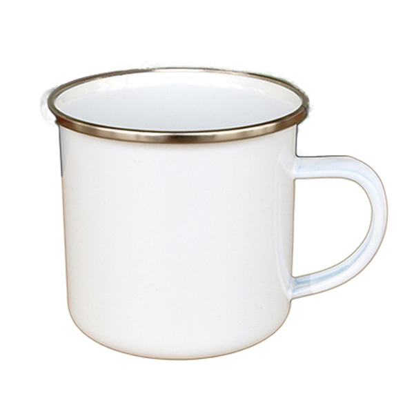 Enamel steel mug (white) with silver rim. The outside of the mug is covered with a special coating, designed for sublimation.