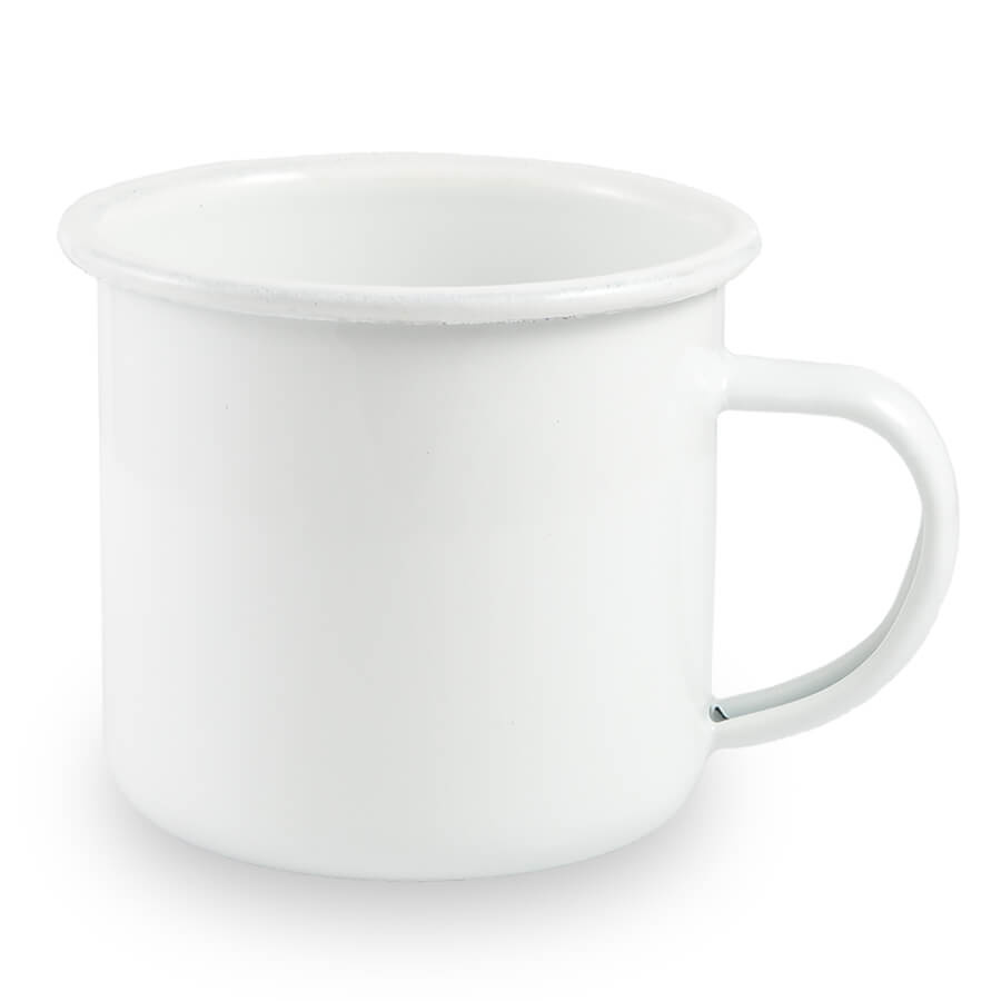 Enamel steel mug (white) with white enamel rim on the rim. The outside of the mug is covered with a special coating, designed for sublimation.-Capacity: about 300 ml
