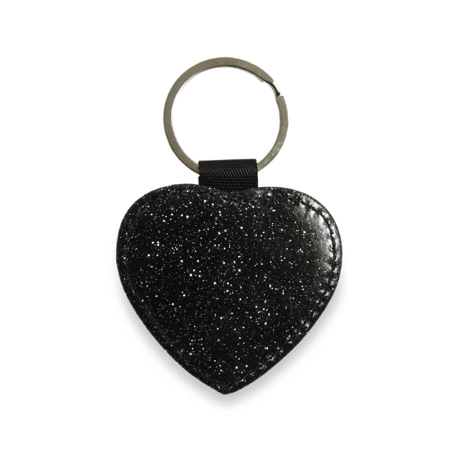 Brelok ekoskóra w kształcie serca, kolor czarny brokat ,dodatkowo metalowe kółeczko. Przeznaczony do nadruku metodą sublimacji.- wymiary: 6cm x 5,5cm