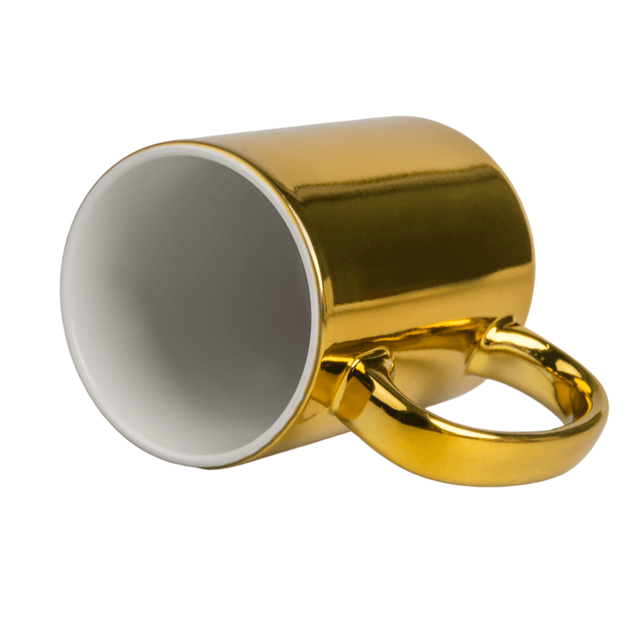 Kubek ceramiczny do nadruku metodą sublimacji. Zewnętrzna strona kubka pokryta jest specjalną powłoką do sublimacji.Kubek złoty, błyszczący (środek biały), biała krawędź: