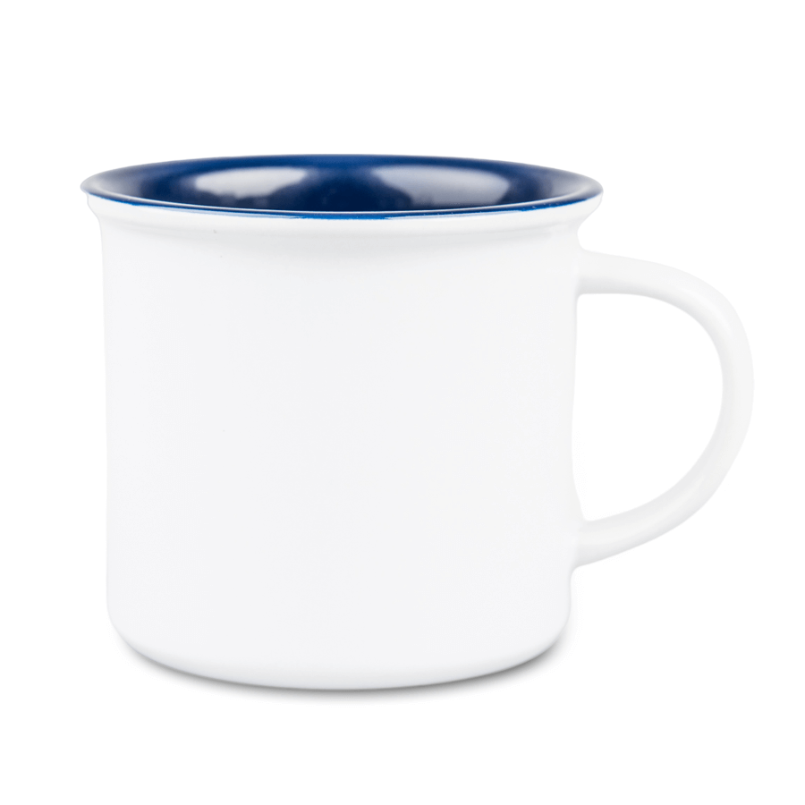 Kubek ceramiczny do nadruku metodą sublimacji. Zewnętrzna strona kubka pokryta jest specjalną powłoką przeznaczoną do sublimacji.Kubek ceramiczny biały Camper środek granatowy