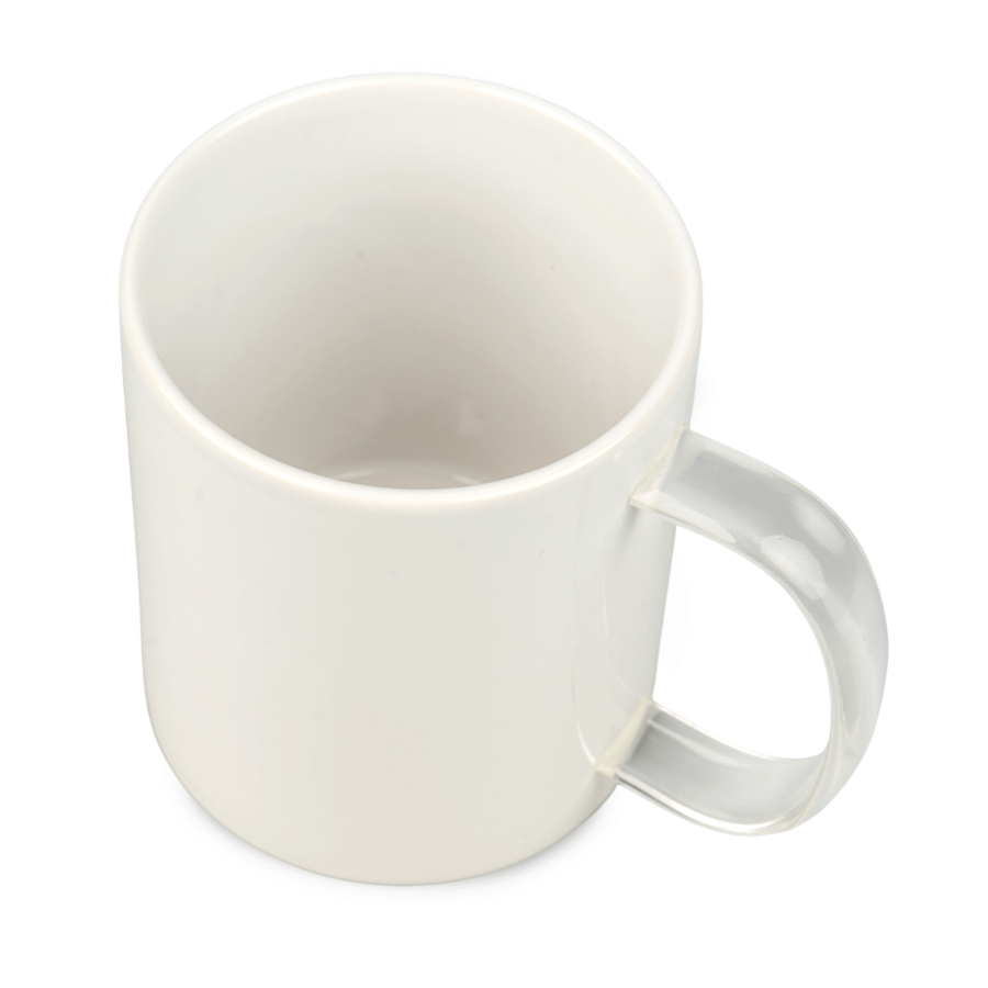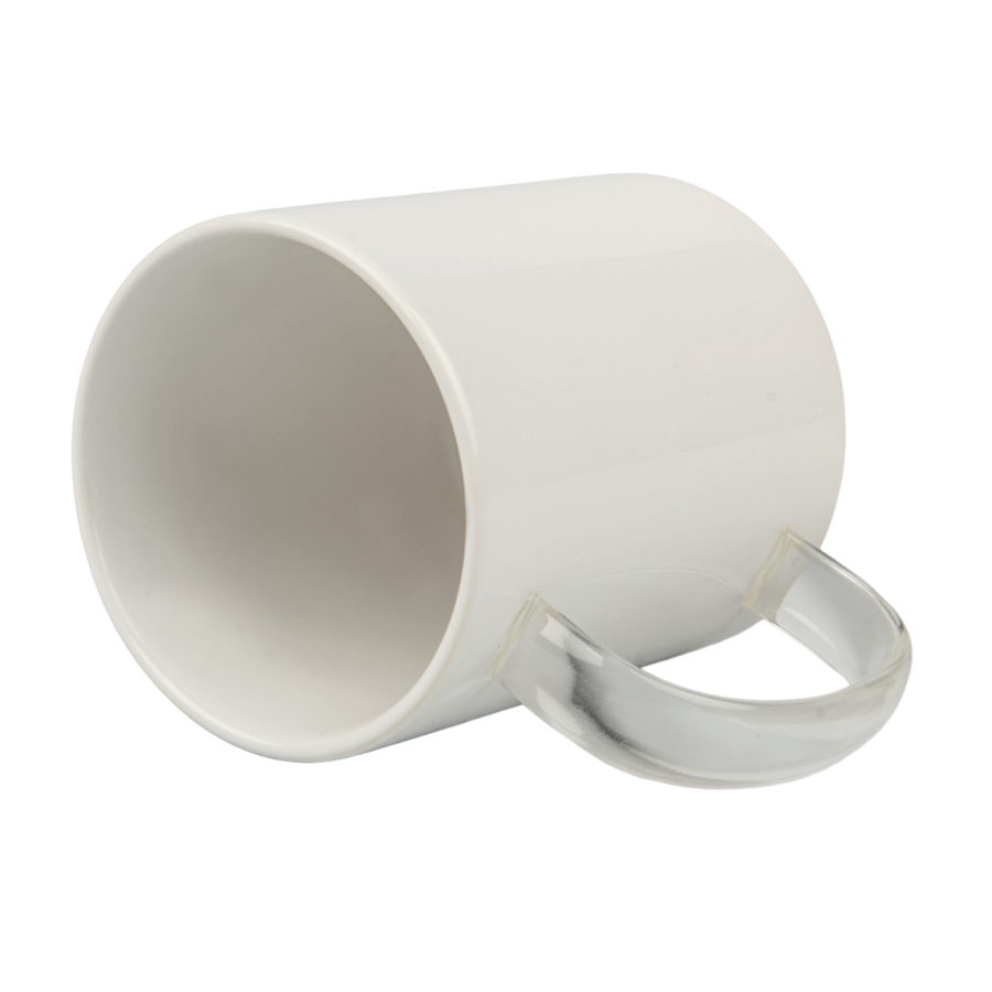 Kubek biały ceramiczny z uchwytem szklanym do nadruku metodą sublimacji. Zewnętrzna strona kubka pokryta jest specjalną powłoką przeznaczoną do sublimacji.- pojemność: ok. 300 ml