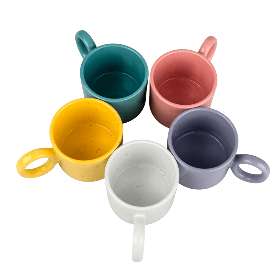 Kubek wyróżnia się unikalnym wzorem drobnych kropek, które nadają mu charakteru i rękodzielniczego stylu.