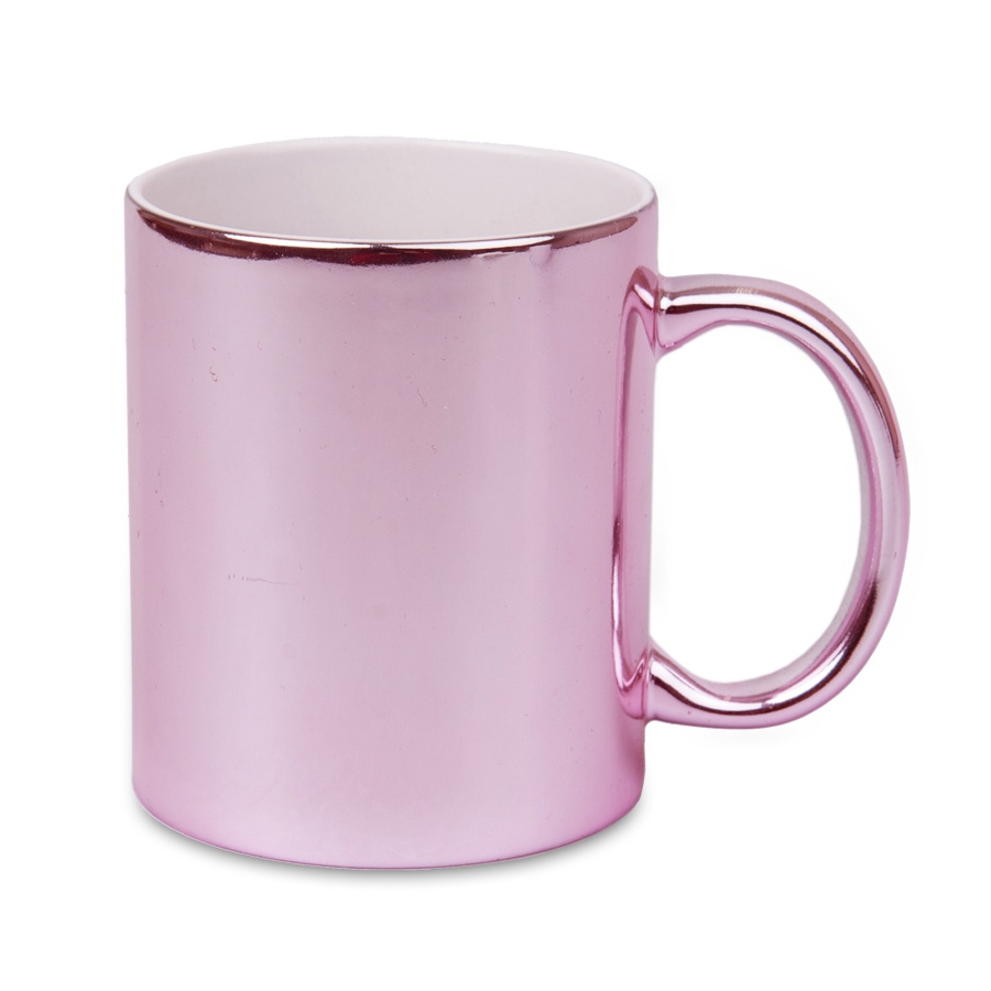 Kubek ceramiczny do nadruku metodą sublimacji. Zewnętrzna strona kubka pokryta jest specjalną powłoką do sublimacji.Kubek różowy metalic - błyszczący (środek biały), biała krawędź:
