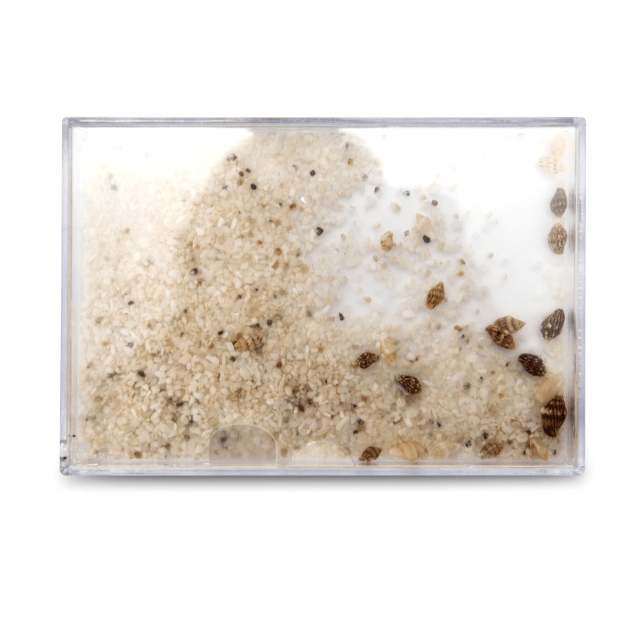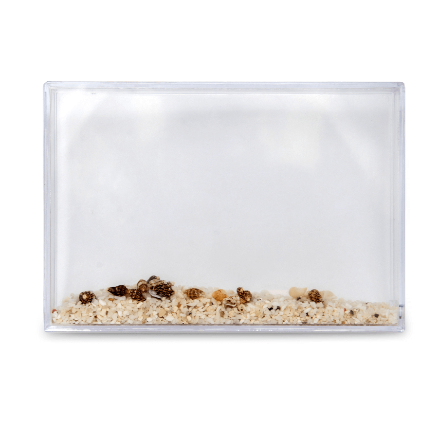 Wykonana z przeźroczystego plastiku, wypełniona wodą, piaskiem i muszelkami.