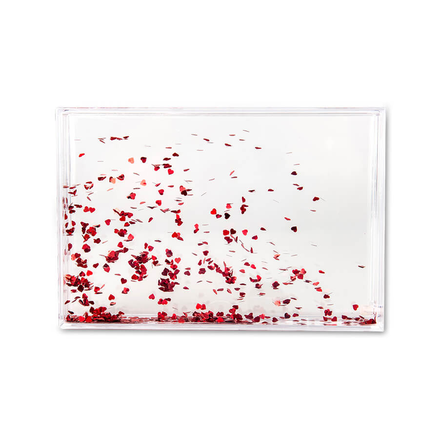 Ramka w kształcie prostokąta na zdjęcie o wymiarach 10x15 cmWykonana z przeźroczystego plastiku, wypełniona wodą i konfetti.