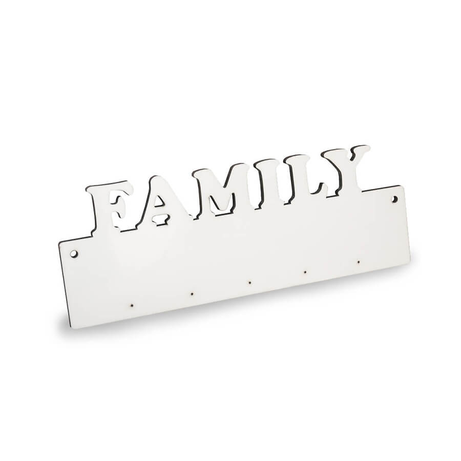 Wieszak MDFna klucze z wyciętym słowem FAMILY, po wygrzaniu w nawiercone otworki wkręcamy pięć haczyków na klucze.- powierzchnia nadruku: 27,5 cm x 10 cm